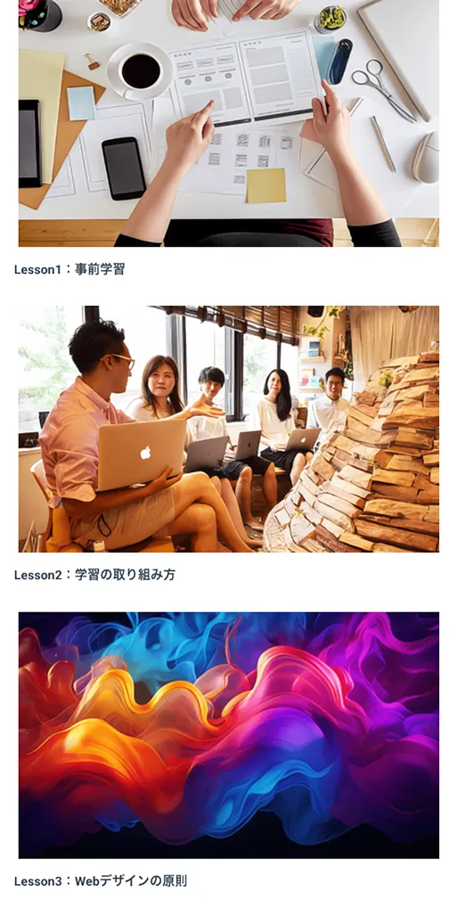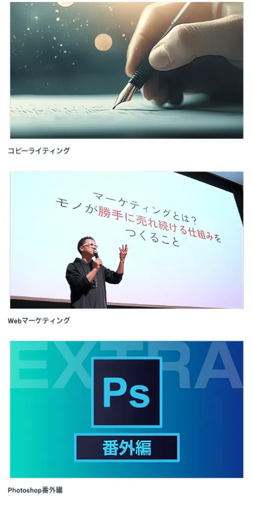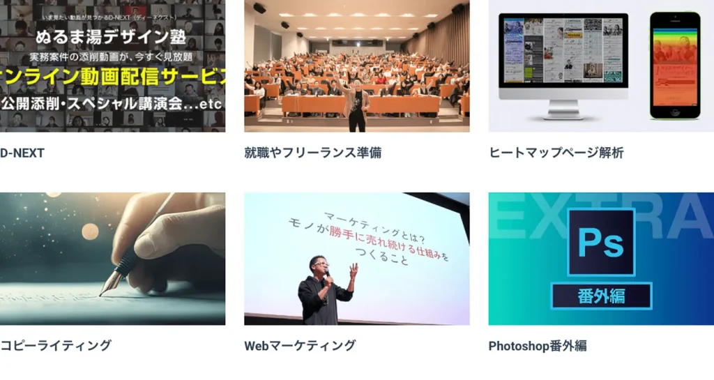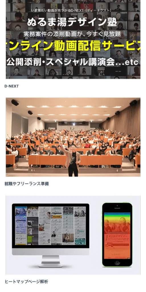 3ヶ月でプロレベルのWEBデザイン習得を目指します。 <サービス&サポート> ①専用会員サイト ②専用チャットで質問無制限 ③ビデオチャットで直接レッスン ④超実践課題 ⑤クラウドサービスでの実務経験 ⑥最新情報をGET ⑦事務局による徹底サポート ⑧毎月オンラインセミナー ⑨週報制度 ⑩オフライン勉強会や合宿 ⑪ぬるま湯生専用コミュニティ |